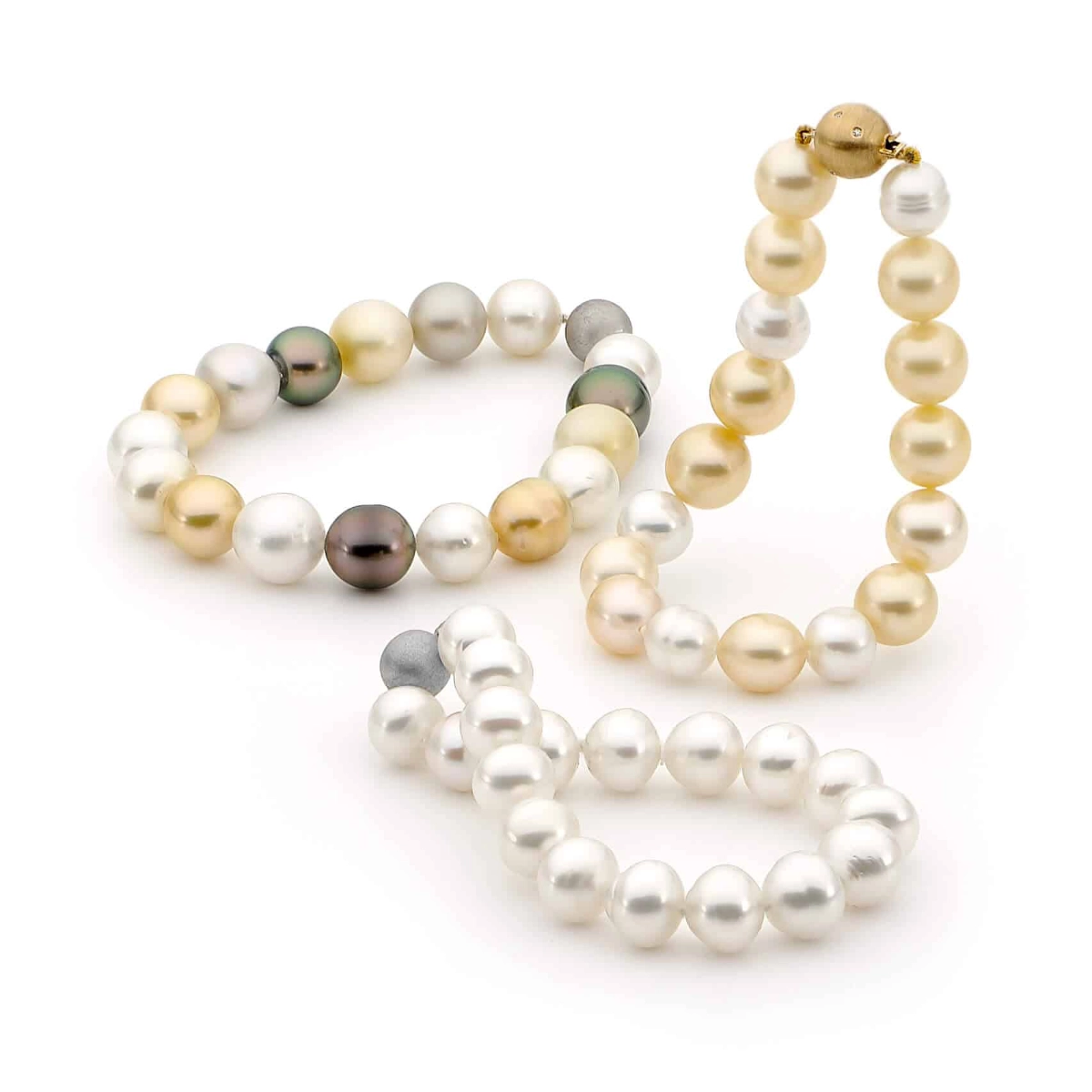 A – A combination of Australian South Sea Pearls, Tahitian Black Pearls and Golden pearls with an 18ct White gold clasp